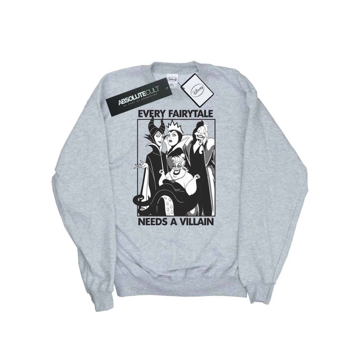 Materiaal: 100% ringgesponnen katoen. 153gsm. Personages: Cruella De Vil, Boze Koningin, Maleficent, Ursula. Ontwerp: Gedrukt, Tekst. Rug Nek Tape. Stoftechnologie: Zwaargewicht. Hem: Ribben. Halslijn: Crew Neck, Ribbed. Mouwtype: Met lange mouwen. Manchet: Ribbel. Bevestiging: Trek aan de achterkant. 100% Officieel Gelicentieerd. Verpakking: Schommelingsmarkering.