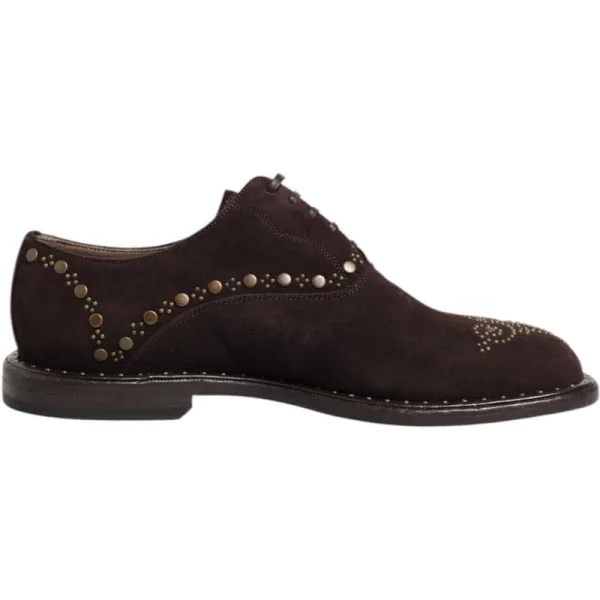 DOLCE & GABBANA Prachtige gloednieuwe, 100% authentieke Dolce & Gabbana veterschoenen van donkerbruin suède, voorzien van decoratieve studs en appliqués. Deze herenschoenen kenmerken zich door een ronde neus, platte leren zool en een vetersluiting. Model: Oxford Kleur: Bruin Materiaal: 100% capra Leren buitenzool Vetersluiting Logo-details Gemaakt in Italië Zeer exclusief en van hoge kwaliteit vakmanschap