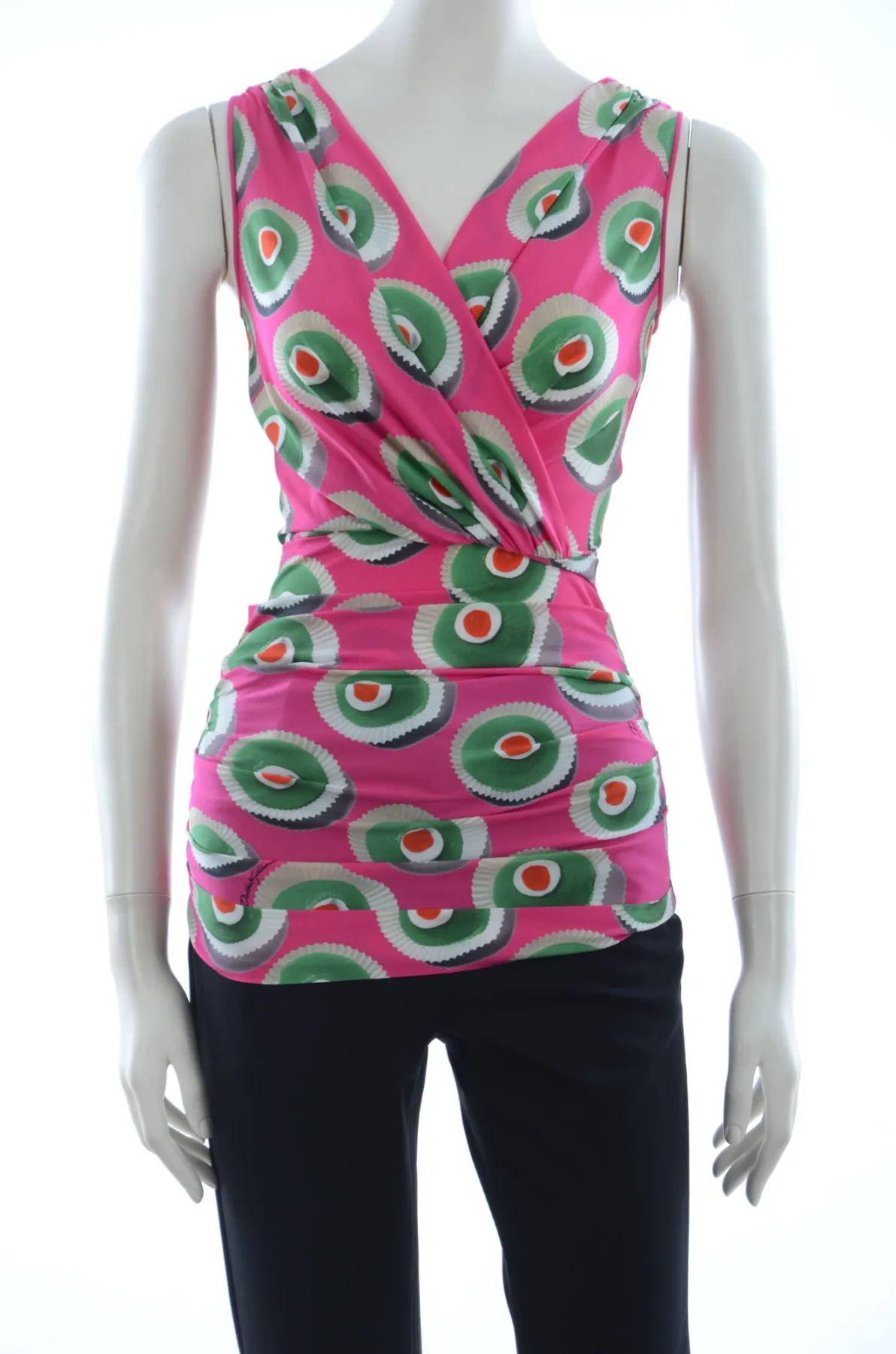 Dolce & Gabbana Schitterende gloednieuw met tags, 100% Authentieke DOLCE & GABBANA top. Model: Blouse mouwloze top Kleur: Roze met veelkleurige Siciliaanse cake print Ritssluiting achter Logo details Made in Italy Zeer exclusief en hoog vakmanschap Materiaal: 94% Zijde, 6% Elastaan