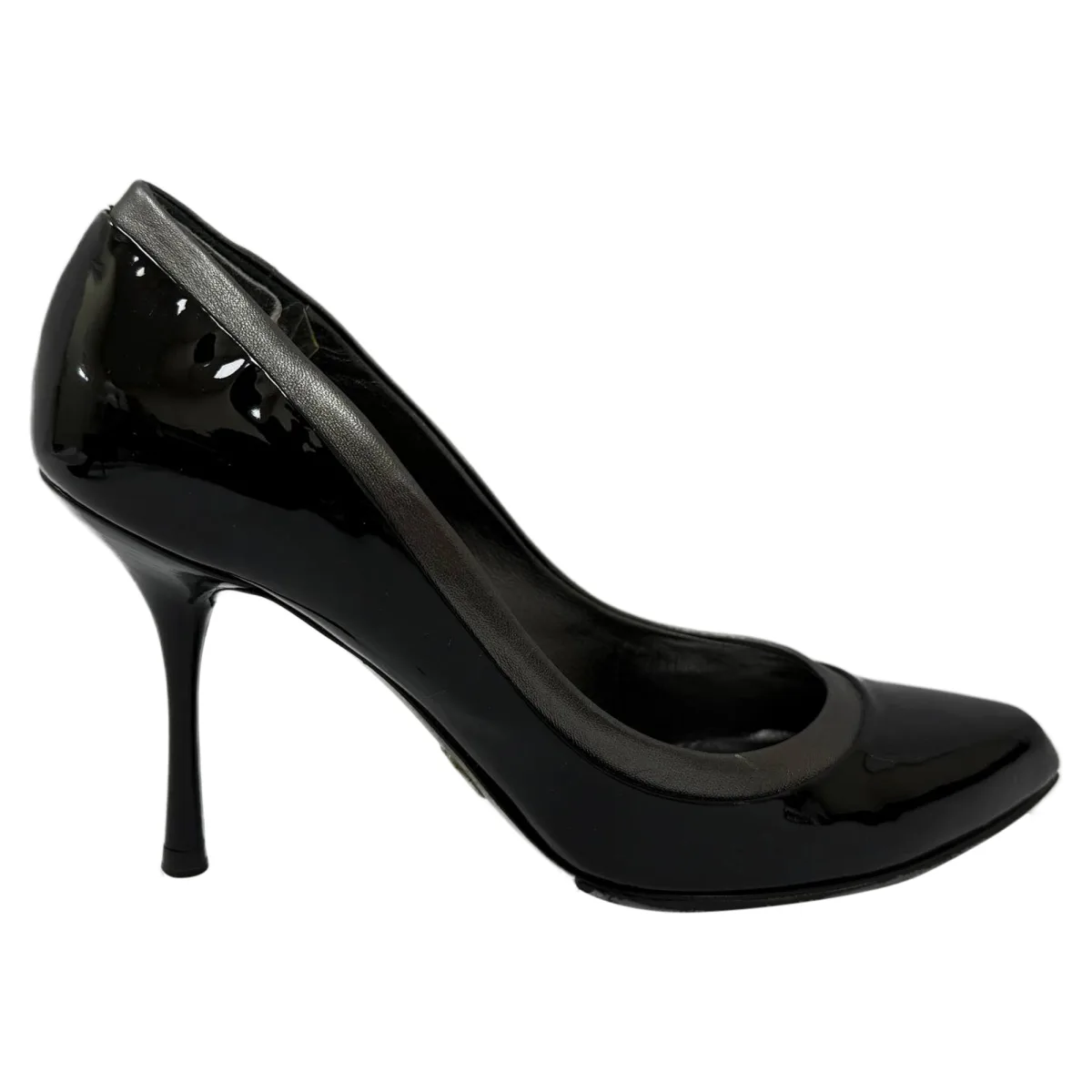 VINTAGE, RRP ALS NIEUW De zwarte lakleren pumps van Dolce & Gabbana brengen tijdloze elegantie tot leven met een moderne touch. Met ronde neuzen en een slanke zilveren lederen afwerking voegt dit paar subtiele glans toe aan een iconische silhoutte. Een gepolijste afwerking maakt ze perfect voor zowel verfijnde dagelijkse outfits als avondkleding. Dolce & Gabbana Pumps in Zwart Lakleer Staat: goed Gebruikssporen: Zeer lichte markering op de zolen. Verpakking: Doos Kleur: zwart Materiaal: Leer | lakleer Maat: EU | 36 Afmetingen: Hakhoogte: 100 mm; Binnenzool lengte: 260 mm SKU: TONPUGBSH546404W