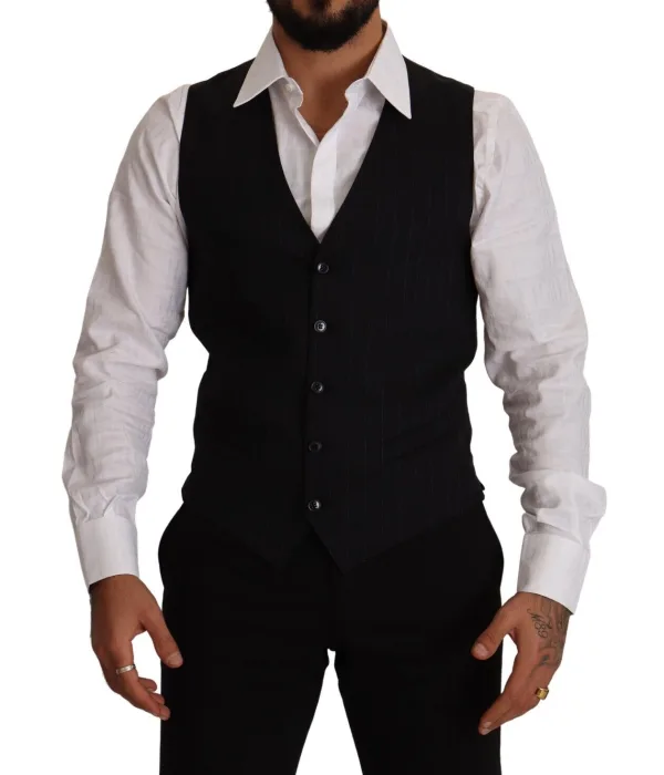 DOLCE & GABBANA Absoluut oogverblindend, 100% Authentiek, gloednieuw met labels, diep geëngageerd dress vest met één rij knopen. Kleur: Donkerblauw gestreept Model: Formeel dress suit vest Logo details Gemaakt in Italië Materiaal: 97% Virgin Wool 3% Elastaan Voering: 100% Viscose