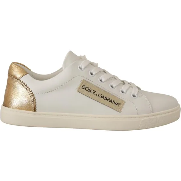 Stap eruit, val op, schitter voort. Deze leren sneakers van Dolce & Gabbana bieden moeiteloze designerstijl voor je dagelijkse avonturen. Het luxueuze witte leer, accentueert met elegante details in goudtint, tilt elke casual look naar een hoger niveau. Ervaar een veilige, verstelbare pasvorm met de klassieke vetersluiting. De rubberen zool zorgt voor uitstekende grip en biedt stabiliteit bij elke stap. Geniet van duurzame, onderhoudsvriendelijke draagervaring dankzij de kwaliteitsvolle leren constructie. Perfect voor casual uitjes, deze veelzijdige sneakers integreren naadloos in jouw levensstijl en voegen een vleugje Italiaanse glamour toe aan jeans, jurken en alles daartussenin.