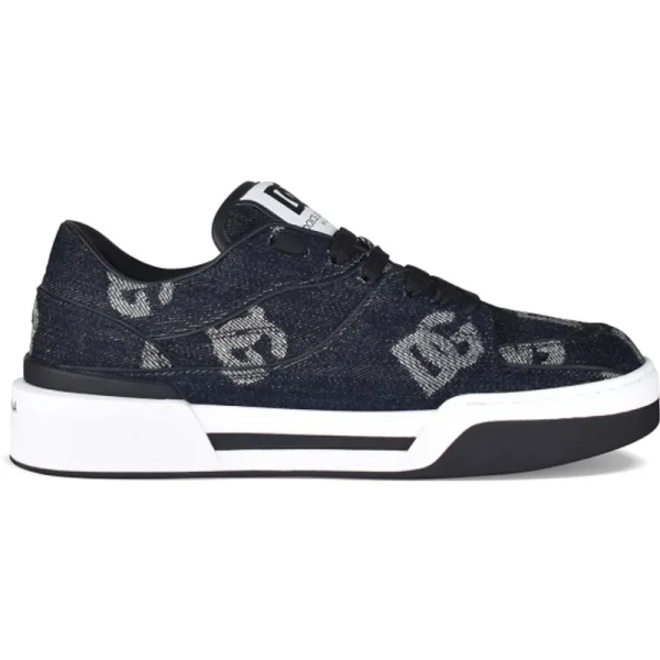 Dolce & Gabbana New Roma sneakers in marineblauw denim.Grijze DG logoprint over de hele schoen.Zwarte vetersluiting.Tong met logo.Dikke rubberen zool met zwart logo.Gemaakt in Italië.