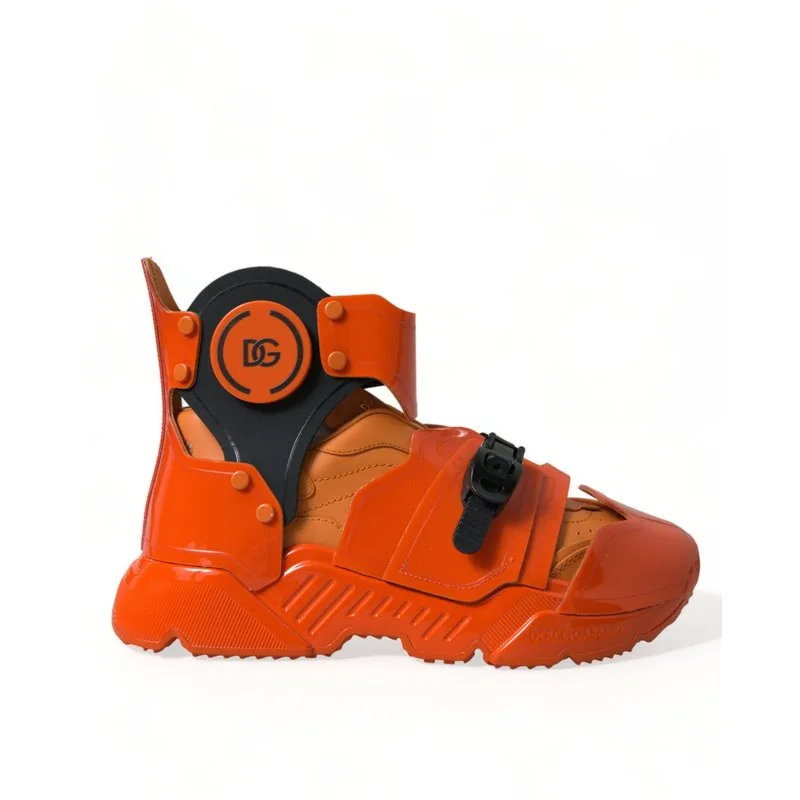 DOLCE & GABBANA Prachtige gloednieuwe sneakers met labels, 100% Authentieke Dolce & Gabbana high top sneakers met logo patch aan de zijkant, meerpanel ontwerp, ronde neus, voorsluiting met gesp, overmaatste tong, branded binnenzool, lus aan de hiel en geribbelde rubberen zool. Model: High top sneakers Materiaal: 60% PVC 40% Kalfsleer Kleur: Oranje Rubberen zool Gespsluiting Logodetails Gemaakt in Italië Zeer exclusief en hoge ambachtelijkheid