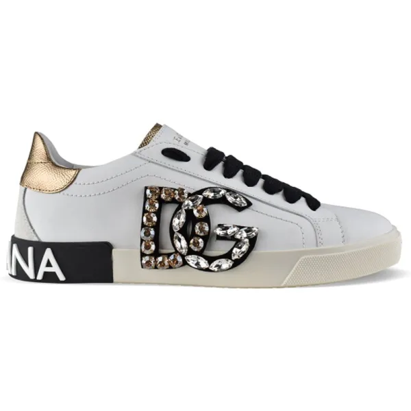 Sneakers Portofino Dolce & Gabbana in wit leer.DG signature logo in zwart versierd met gouden en zilveren kristallen op de zichtbare zijkanten. Dolce & Gabbana Milano geschreven in goud op de tong.Goud generfd lederen teller en tong teen.Zwarte veters.Beige suède hiel.Wit-op-zwart Dolce & Gabbana logo op achterkant van zool.Witte rubberen zool.Made in Italy.