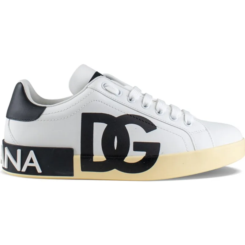 Dolce&Gabbana Portofino lage sneakers van wit leer.Zwart logo gedrukt op de zichtbare kant.Zwart leren zool.Witte platte veters.Zwarte logopatch op de achterkant van de zool.Zwarte logopatch op de tong.Rubberen buitenzool met vergeeld effect.Gemaakt in Italië.