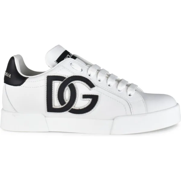Portofino lage sneakers van Dolce&Gabbana in wit leer.Zwarte logoprint in reliëf op de zijkant.Zwart leren toonbank met logo.Zwarte logopatch op de tong.Witte platte veters.Witte rubberen buitenzool.Gemaakt in Italië.