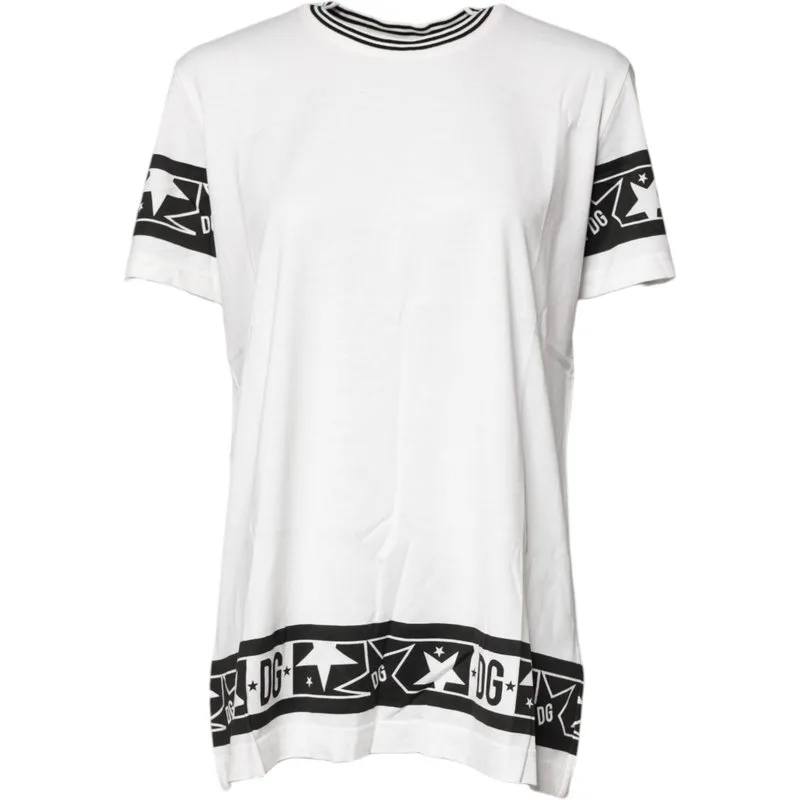 Verhoog, uitdrukken, indruk maken. Dit T-shirt van Dolce & Gabbana mengt iconische stijl met supreme comfort voor je dagelijkse garderobe. Gemaakt van 100% katoen, voelt het luxueus zacht aan op je huid, wat zorgt voor draagcomfort gedurende de hele dag. De klassieke ronde hals en korte mouwen bieden een tijdloze silhouet, terwijl de moeiteloze, relaxte pasvorm ultiem comfort biedt. Met een gedurfde DG-logo en sterprint op de mouwen en zoom, voegt dit T-shirt een onmiskenbare designer flair toe. Combineer het met jeans, shorts of een rok voor een look die zowel moeiteloos chic als duurzaam stijlvol is.