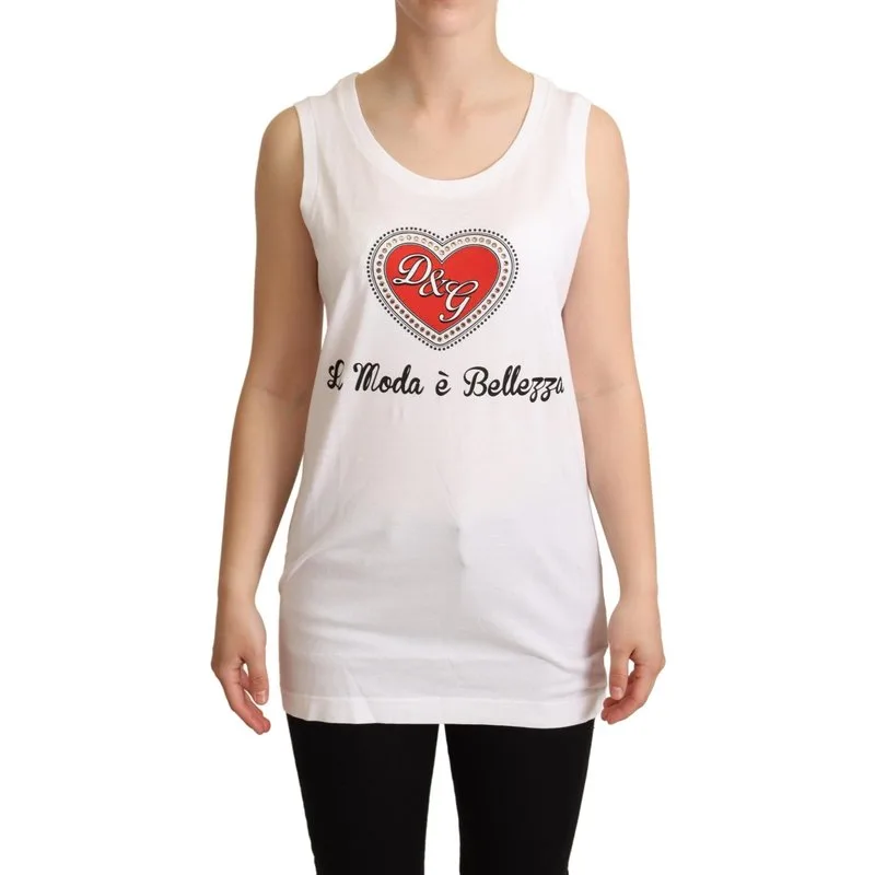 Verhoog, uitdrukken, betoveren. Deze Dolce & Gabbana tanktop geeft je dagelijkse stijl meteen een vleugje iconische Italiaanse glamour. Gemaakt van 100% premium katoen, biedt het luxueus, ademend comfort voor de hele dag. De opvallende rode hartgrafiek, versierd met het iconische DG-logo en 'L Moda e Bellezza' (Mode is Schoonheid), maakt een gedurfde, verfijnde uitspraak. De klassieke ronde hals en het mouwloze ontwerp zorgen voor een frisse, onbelemmerde draagervaring, terwijl de onderhoudsvriendelijke constructie blijvende aantrekkingskracht belooft. Perfect voor modebewuste vrouwen, deze veelzijdige top gaat moeiteloos van casual uitjes naar chique evenementen, met een viering van Italiaanse ambacht en tijdloos design.