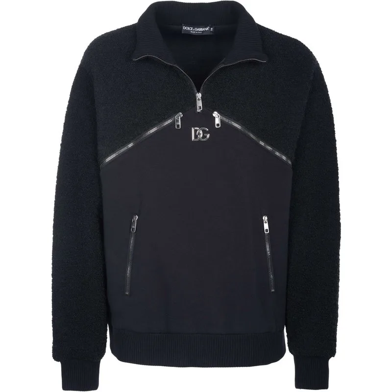 30% acryl, 28% katoen, 27% polyester, 15% wol; Dolce & Gabbana-trui; Model: G9XZ8Z G7DMF 15; Hoogwaardige afwerking; Zachte katoenmix; Oversized pasvorm; opstaande kraag; halve ritssluiting; logo-embleem; Decoratieve ritsen aan de voorkant; Twee zijzakken met ritssluiting; lange mouw; Verticale halve ritssluiting onderaan de achterkant; Dolce & Gabbana-logodetails
