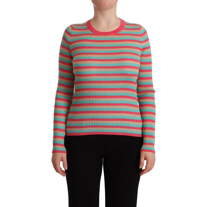Verhef, flatter en definieer je stijl met dit exquisite rib gebreide top van Dolce & Gabbana. Gemaakt van een luxueuze mix van 95% viscose en 5% elastaan, biedt het ongeëvenaarde zachtheid en een comfortabele, figuuraccentuerende pasvorm. Het opvallende multicolor streepjespatroon in verfijnd roze, blauw en beige voegt een moderne flair toe. De getailleerde snit en klassieke ronde hals zorgen voor een flatterende look voor elke gelegenheid. Dit veelzijdige stuk gaat moeiteloos van dagelijkse elegantie naar speciale evenementen, waardoor het een tijdloos mode-item is. Verwen jezelf met luxe die net zo goed aanvoelt als het eruitziet.