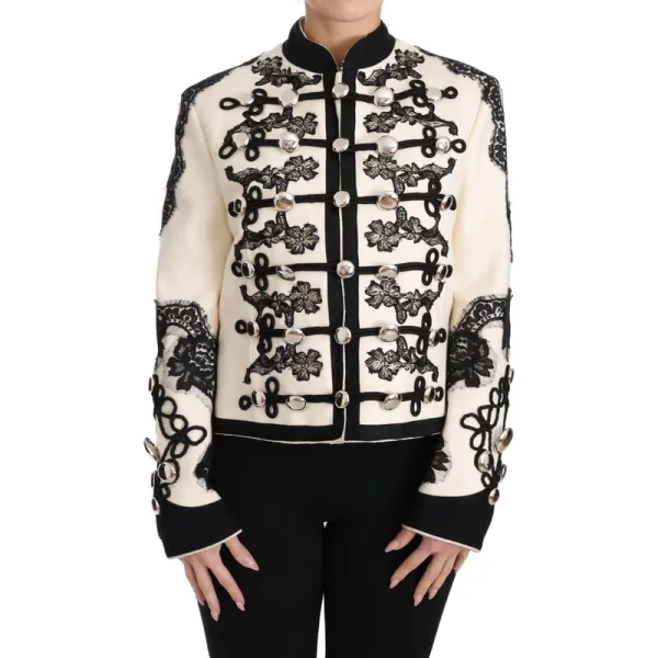 Dolce & Gabbana Witte Wol Zwarte Bloemen Barok Jas
