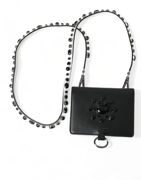 Dolce & Gabbana Zwarte Leren Kaarthouder Portemonnee met Kristalversiering