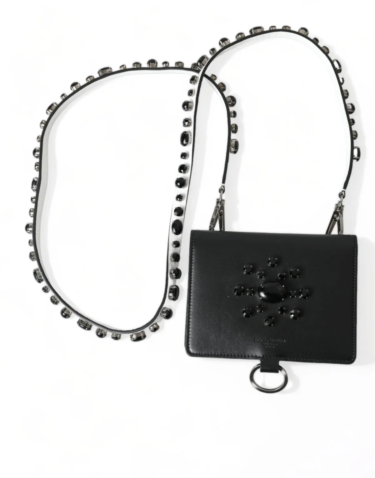 DOLCE & GABBANAPrachtige gloednieuwe met labels, 100% Authentieke Dolce & Gabbana Zwarte kalfsleren kaartenhouder met kristalversiering, drukknoopsluiting, interne kaartvakken en afneembare nekriem.Model: Kaartenhouder portemonneeMaterialen: Leer, KristalKleur: Zwart met zilverkleurige metalen detailsZwarte binnenvoeringMagnetische sluitingLogo-details, logo gegraveerd metalen beslagGemaakt in ItaliëZeer exclusief en zeer hoge ambachtelijke kwaliteitAfmetingen: 14 cm x 10,5 cm x 3 cmRiempje: 112 cm x 1 cm