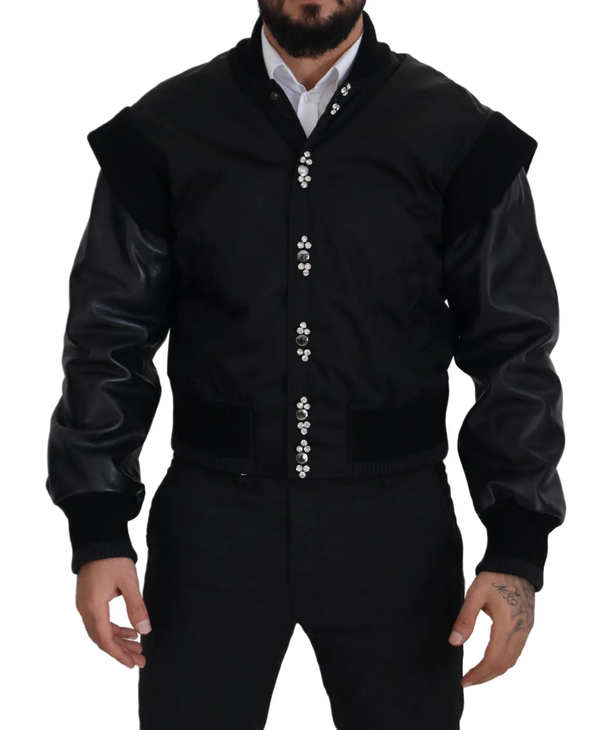 DOLCE & GABBANA Absoluut adembenemend, 100% authentiek, gloednieuw met labels Dolce & Gabbana zwarte nylon bomberjack met kristalversiering. Voorzien van lange mouwen. Ribgebreide onderrand en manchetten. Model: Bomberjack Kleur: Zwart Volledige knoopsluiting Logo-details Gemaakt in Italië Materiaal: 90% nylon 10% leer Voering: 100% zijde