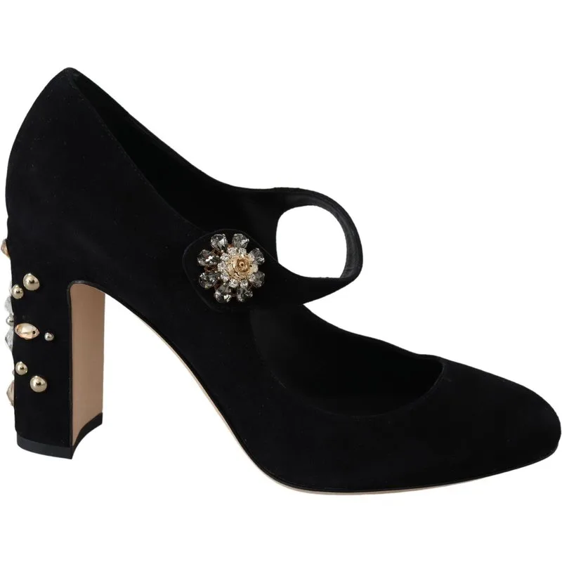 Uitmuntende Dolce & Gabbana Elegante Zwarte Suède Mary Janes Pumps Plooizacht suède leer Dazzling crystals versierde hakken Italiaanse ambacht en elegantie Perfecte mix van stijl en comfort Logo-details aan de achterzijde Leer zool Gemaakt in Italië Materiaal: Suède leer