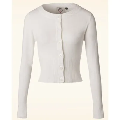 De 50s Dolly Cardigan in Ivory White maakt met iedere outfit een 'perfect match'! Dolly is klassiek, comfortabel én speels. Deze cardigan heeft een elegante ronde halslijn, lange mouwen en grote glimmende knopen. Uitgevoerd in een fijngebreide, ivoorwitte stof met een heerlijke stretch voor een mooie aansluitende pasvorm. De combinatiemogelijkheden zijn eindeloos! * Ronde halslijn * Lange mouwen * Reeks knopen * Boordjes langs de halslijn, mouwen en onderkant * Lang genoeg om op een normale heupbroek te dragen
