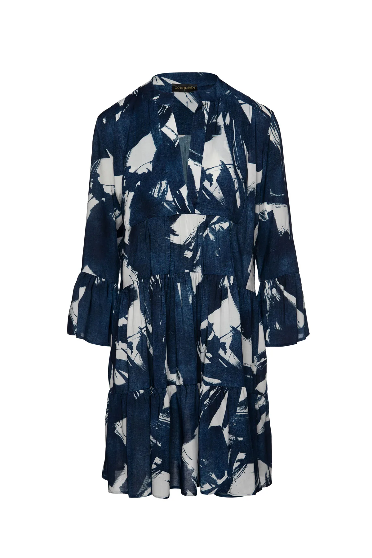 Deze jurk met all-over print en geplooide naden is gemaakt van geweven viscose in de kleuren marineblauw en wit. Met ¾ klokmouwen en een ronde halslijn met een V-opening van 24 cm aan de voorkant. Met een drukknoop onderaan de binnenkant van de V om te voorkomen dat deze te veel opent. Onder de V-opening aan de voorzijde bevindt zich langwerpig gevormde dubbele stof. De jurk heeft twee 24 cm brede, geplooide panelen. Met een dubbele plooi aan de achterkant. De jurk is gestyled in een los A-lijnsilhouet en valt boven de knie.
