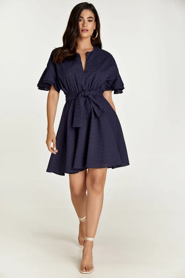 Deze donkerblauwe jurk van geweven katoenen stof is ton sur ton geborduurd. Het heeft korte mouwen met dubbele ruches en hangende schouders. Het heeft een ronde halslijn met een V-opening aan de voorkant. Onder de buste zit een gebogen naad waaronder de jurk uitloopt in een clochestijl. Er zit een verborgen ritssluiting aan de binnenkant waardoor de jurk gemakkelijk kan worden aangetrokken. De jurk is gevoerd. De jurk kan met of zonder de ceintuur van dezelfde stof worden gedragen. De ceintuur is inbegrepen.