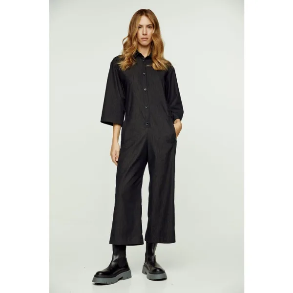 Deze donkergrijze jumpsuit is gemaakt van geweven stretch denim. Het heeft ¾ mouwen en een kraag. De halslijn heeft een split met zwarte plastic knopen. Aan de zijkanten zitten zakken met een riemlus. Het heeft een 3 cm brede riem in dezelfde stof die door twee riemlussen in de taille loopt. Op de rug zit een omgekeerde plooi. De jumpsuit heeft een beenlengte van 7/8.