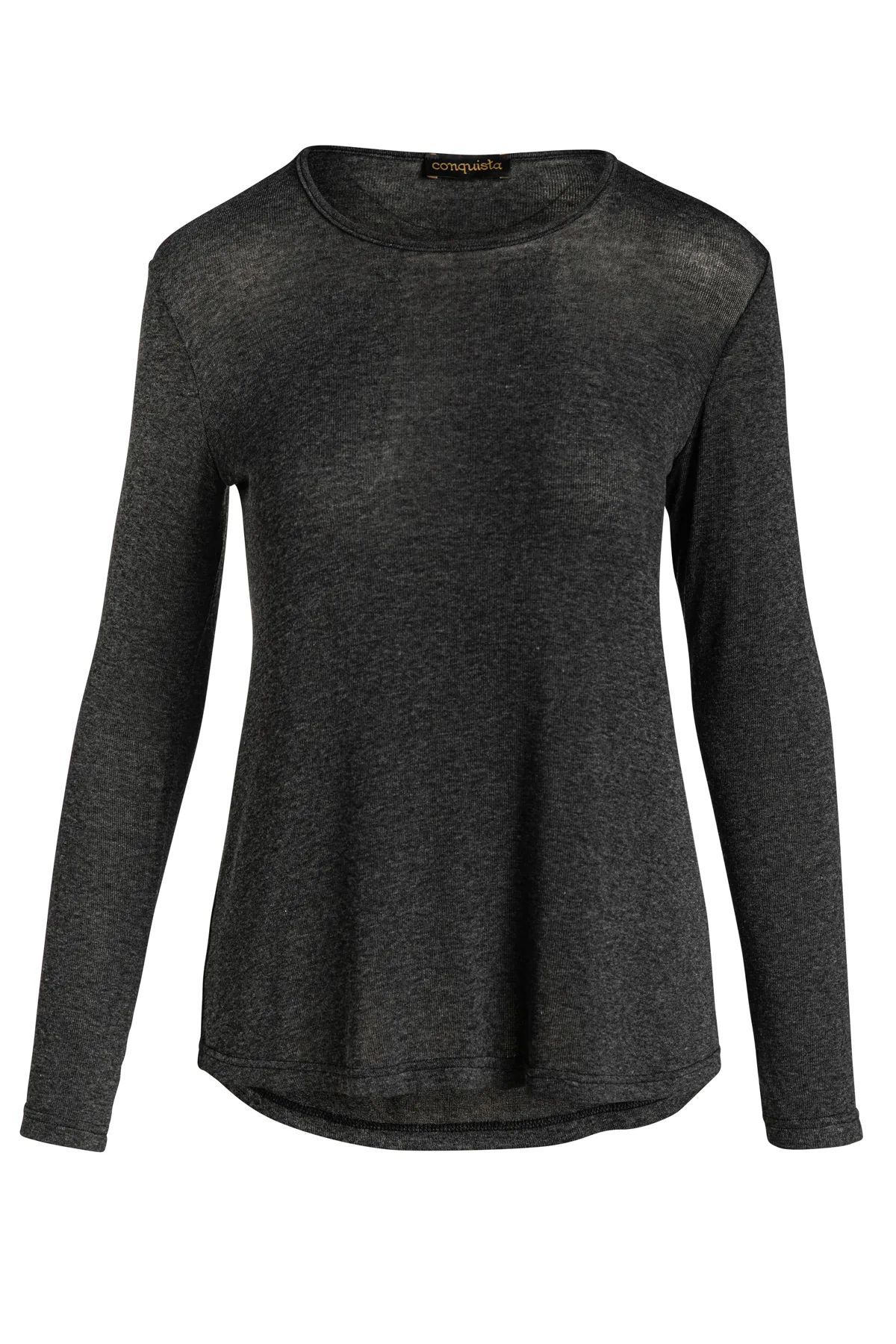 Top met lange mouwen in donkergrijs gemêleerde fijn gebreide stof. Ronde hals en een licht afgeronde zoom. Losse pasvorm. Lengte voor maat 38: 60 cm.