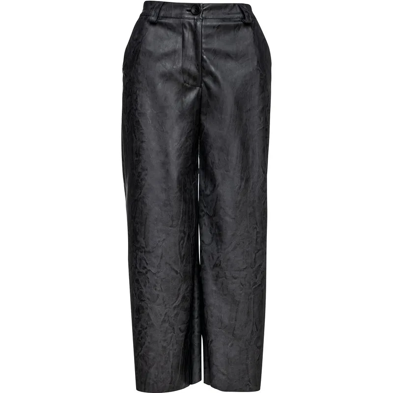 Donkergrijze culottes van geweven faux moiréleer. Tailleband met riemlussen. Zakken opzij. Verborgen rits- en knoopsluiting vooraan. Wijde pijpen. Afgeknipt. Afmetingen voor maat 38/M (in cm): Taille-35, Onderkant-50, Lichaamslengte (Binnen/Buitenkant)-92/64.
