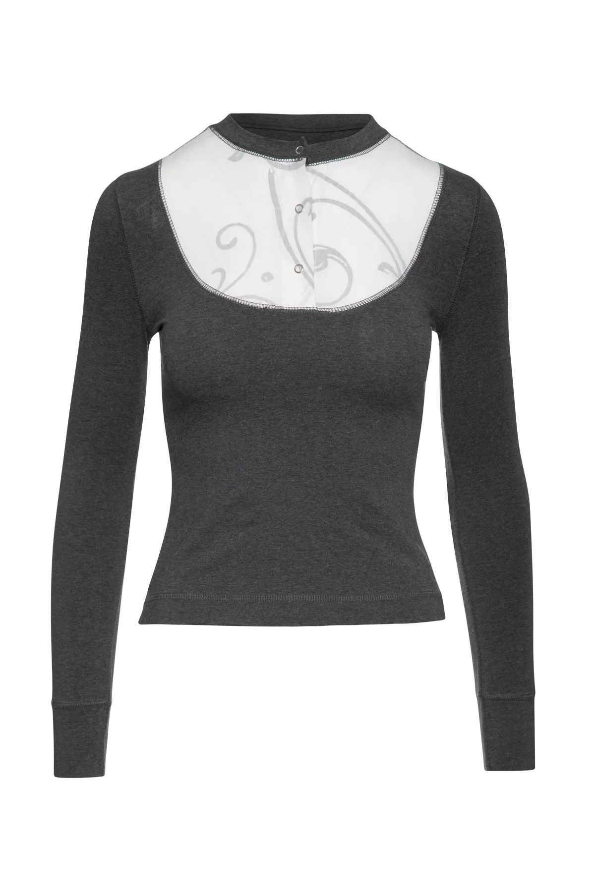 Deze donkergrijze top is gemaakt van stretch jersey ribstof. Het heeft lange mouwen met 8 cm brede manchetten in dezelfde stof. Het heeft een ronde halslijn die aan de voorkant sluit met 3 drukknopen. Op de borst zit een contrasterende ecru popeline stof met een zwarte opdruk aan de binnenkant die een schaduweffect creëert. Deze is afgebiesd met decoratieve donkergrijze stiksels. Op de rug is een applicatie in de vorm van een adelaar in ecru popeline. Er zijn elleboogstukken van contrasterende stof met sierstiksels. De top heeft kleine splitjes aan de zijkanten.
