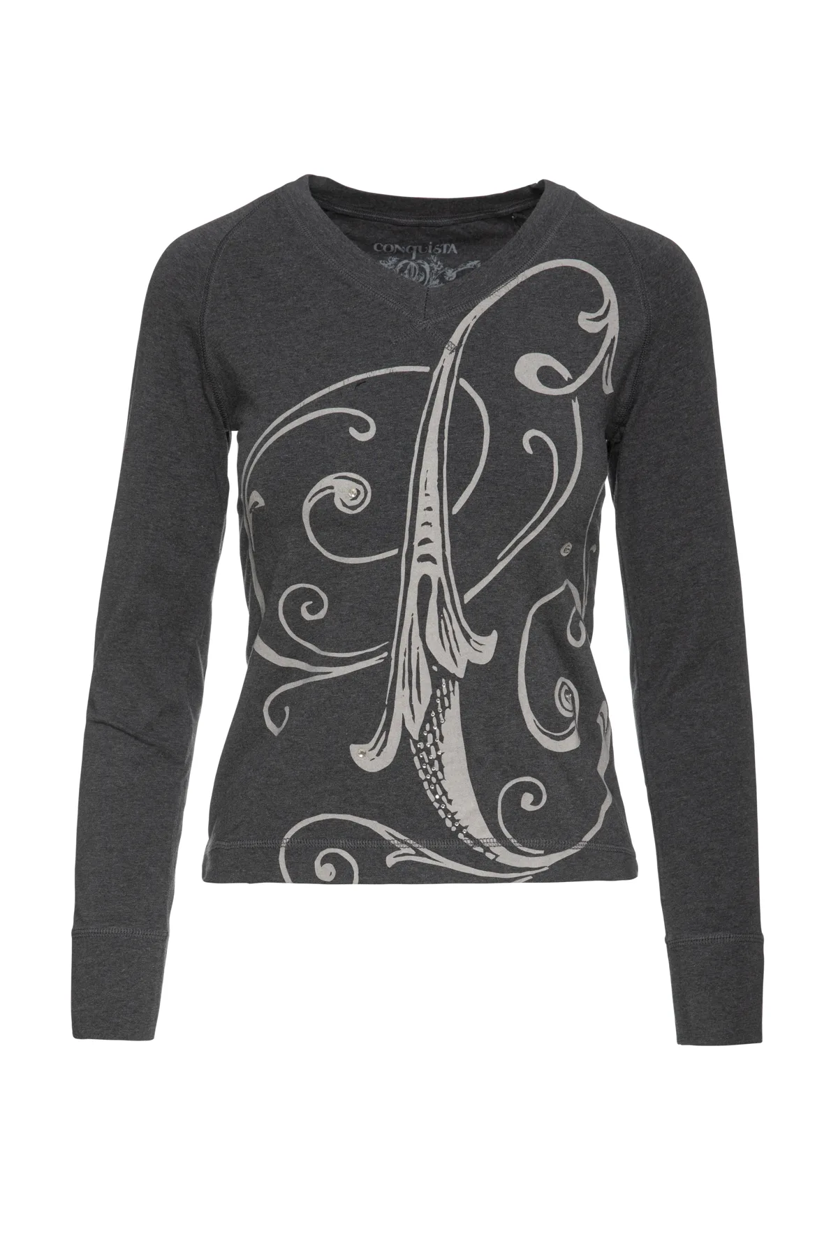 Deze donkergrijze top is gemaakt van jersey met stretch. Hij heeft lange raglanmouwen met manchetten van 8 cm van dezelfde stof. Er zitten patches op de ellebogen. De V-hals heeft een brede rand van dezelfde stof. De top heeft zeer kleine splitjes aan de zijkanten. Op de voorkant zit een grijze print met decoratieve metalen details.