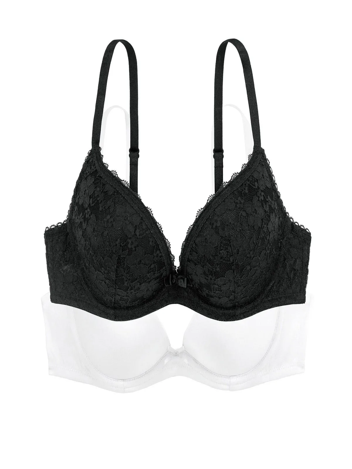 Cup soorten: Demi cup bh; Soort bandjes: Normale bandjes; Bh/bikini type: Push-up; Beugel: Met beugel; Design: Verstelbare riemen; Type sluiting: Haakjes; Motief: Effen; Details: Kant; Extra's: Op staal naden; Aantal: 2 Pack