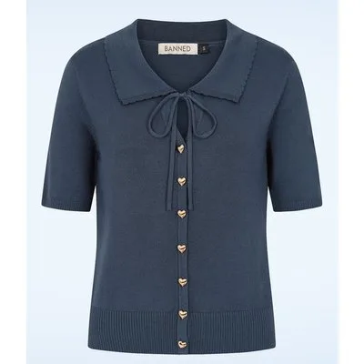 ''If you love it, buy it!'' Deze cutie heeft een kraagje met een geschulpte bies, vaste strikbandjes en goudkleurige knoopjes in de vorm van hartjes. Ze is uitgevoerd in een fijngebreide, zachte en stretchy marineblauwe viscosemix. * Kraag met geschulpte bies * Vaste strikbanden * Korte mouwen * Goudkleurige knopenrij * Stretchy ribboorden