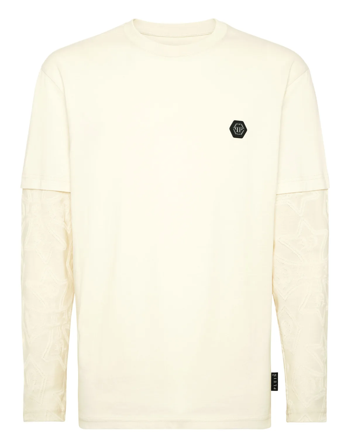 Uniekheid en innovatie zitten in het DNA van Plein en zijn terug te vinden op dit katoenen T-shirt met lange mouwen. Bekijk de details. Katoenen jersey Jacquard inzetstukken Opgenaaide patch met logo op linkerborst Ribgebreide hals Tweenaalds stiksel