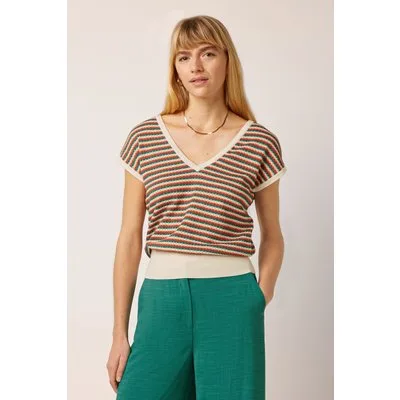 “A touch of retro charm!” Deze funky Diga top heeft een elegante V-hals en V-rug en is uitgevoerd in een zachte, fijngebreide en stretchy biologische katoenmix met een vrolijk streeppatroon in wit, oranje en groentinten, subtiel verrijkt met een ingewerkte glitterdraad. Perfect om iedere look een retro twist te geven! * V-halslijn en V-rug * Korte kapmouwtjes * Stretchy ribboord * Lang genoeg om op een normale heupbroek te dragen