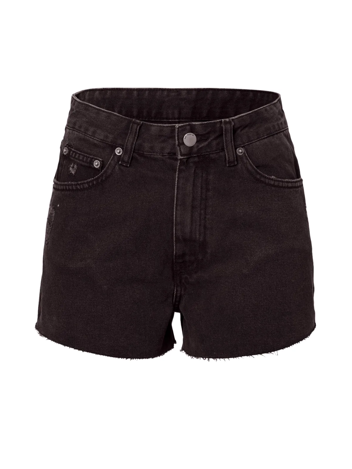 Design: Open randen, Ritssluiting, 5-pocket-style; Materiaal: Denim; Motief: Effen; Details: Franjes; Extra's: Studs, Gewassen effect, Vaste grip; Wassing: Colored denim; Lengte: Kort/mini; Pasvorm: Regular; Taillehoogte: Mid waist