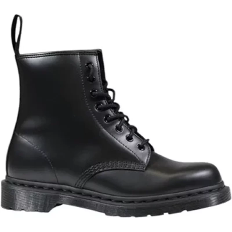 Deze Dr. Martens 1460 Mono Smooth veterboots in het zwart zijn gemaakt van leer, net als de voering en comfortabele binnenzool. Ondanks dat de welbekende gele accenten zijn weggelaten, herken je het merk aan de gegroefde zijkanten, sierstiksels en aantreklus. Door de monochrome look kan je de boots eindeloos combineren: onder een rok, lange of korte jurk, strakke spijkerbroek of wijde pantalon. Het maakt niet uit wat je draagt, want deze boots maken ongetwijfeld jouw outfit helemaal af. Door middel van een veter, in combinatie met het aantreklusje aan de achterkant, trek je de veterboots snel aan en uit. De profielzool is gemaakt van rubber en heeft een dikte van 3 centimeter. Het voetbed van deze zwarte Dr. Martens 1460 Mono Smooth veterboots is niet uitneembaar.