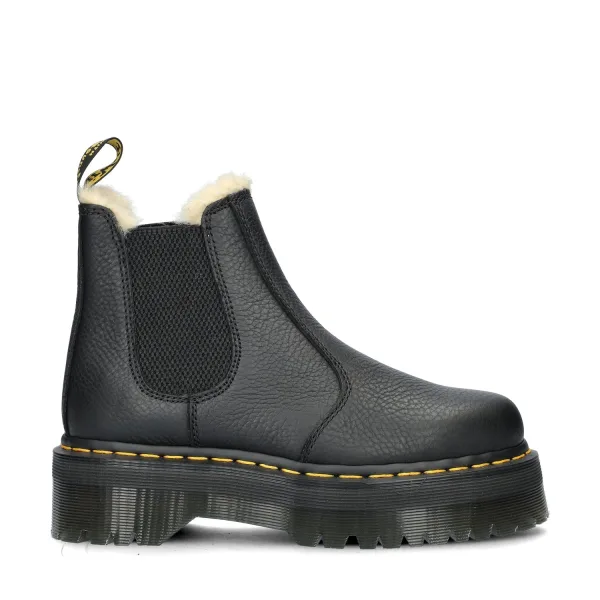 Dr. Martens Quad dames chelseaboot De iconosche boots van Dr. Martens zijn in een winterse uitvoering gekomen, gevoerd met imitatiebont en voorzien van een chunky profiel zool. De boot is gemaakt van zacht Pisa leer en beschikt over een elastisch inzetstuk die het gemakkelijk maakt om de laars aan en uit te trekken. Gevoerd met een zacht imitatiebont wat warme voeten garandeerd gedurende de koudere dagen! Gebouwd op de iconische en comfortabele Dr. Martens luchtkussen zool voor ultiem comfort. De 4,5 cm hoge platformzool is met de welbekende gele stiksels bevestigd aan de schoen.