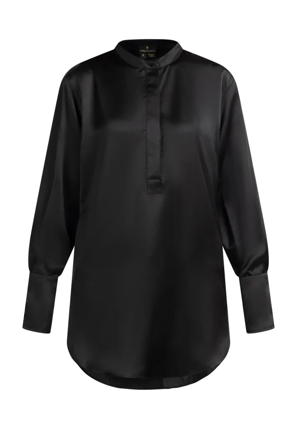Geen voering/geen voering, geen vulling Deze blouse van Dreimaster Klassik heeft een klassiek silhouet dat stijlvol bij je garderobe past. Dankzij de glanzende satijnen look en aangename lengte kan hij ook over een broek gedragen worden. De knoopsluiting is verborgen en zorgt zo voor een harmonieuze look. Een ander aspect zijn de smalle mouwuiteinden met manchetten, die bijzonder flatterend zijn. Bloes met lange mouwen