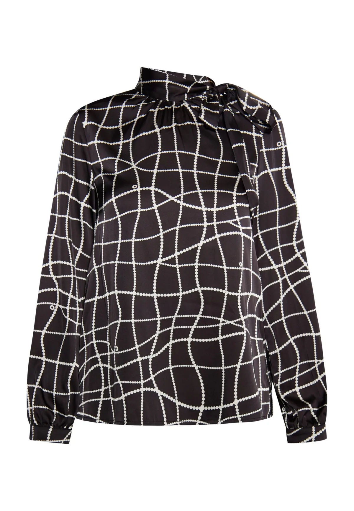 Of je de blouse nu naar kantoor, naar een diner of naar een avondevenement draagt, het zijdezachte, glanzende model van DreiMaster Klassik straalt pure elegantie uit. Gemaakt van een soepele stof, heeft het een opstaande kraag met strikband aan de zijkant en een vrouwelijke print met zwarte parelkettingen verspreid over het overhemd met strikkraag. Bloes met lange mouwen