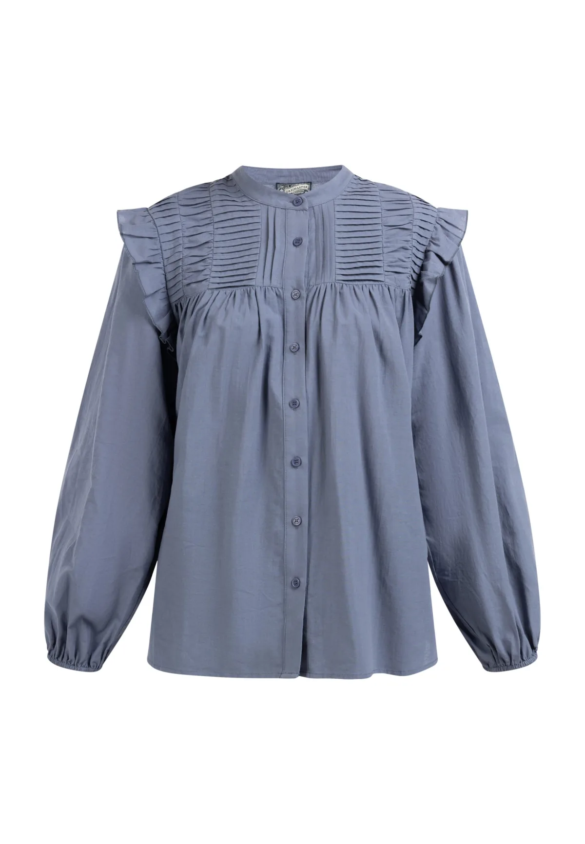 Geen voering/geen voering, geen vulling De effen katoenen blouse van DreiMaster Vintage combineert romantische flair met een los vintage design. Het losse design van luchtig katoen wordt gekenmerkt door een geplooide opstaande kraag en een ruche op de schouder. De lange mouwen zijn afgewerkt met elastische manchetten, waardoor ze meer volume hebben. Bloes met lange mouwen