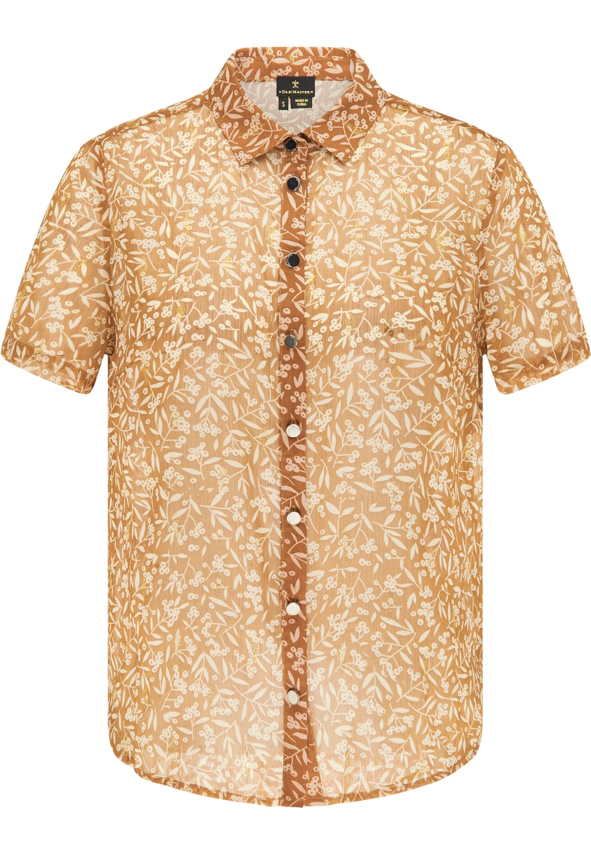 Geen voering/geen voering, geen vulling Deze lichte en semi-transparante chiffon blouse van DreiMaster Klassik scoort met zijn betoverende print met delicate, goudkleurige deeltjes die in een offset patroon over de stof druppelen. Het slanke, rechte silhouet heeft een overhemdkraag, korte mouwen en een afgeronde zoom. Met zijn lichte textuur past hij perfect bij broeken en rokken. Blouse