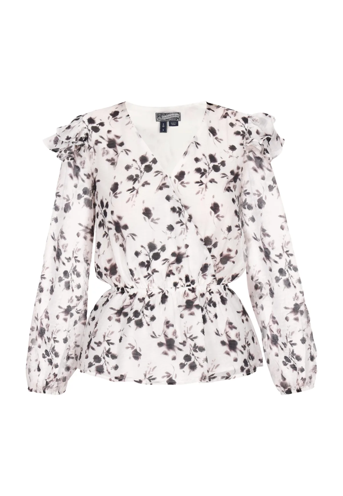Laat u betoveren door de charme van deze prachtige blouse met fascinerend bloemmotief. De V-hals en delicate ruches op de schouders stralen vrouwelijkheid uit. Met lange mouwen en elastische manchetten voor een licht pofeffect, biedt het een chique silhouet dankzij de getailleerde pasvorm. Dit elegante ontwerp is gemaakt van lichtgewicht, soepele stof en kan moeiteloos worden gedragen bij casual tot semi-formele gelegenheden. Blouse