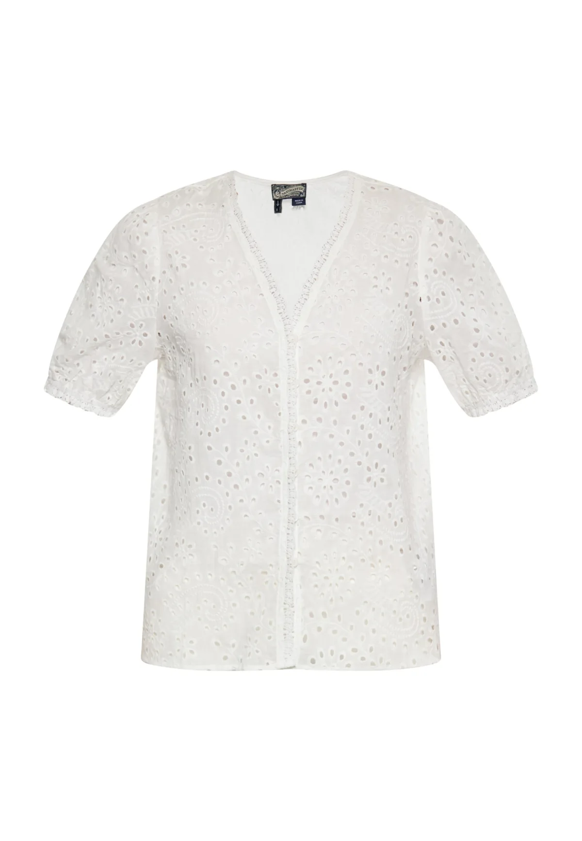 Ontdek deze chique blouse met een fladderende V-hals en een button-down voorkant. Het heeft een normale pasvorm, korte pofmouwen en een rechte zoom voor een moeiteloze zomerlook. Het geborduurde patroon is gemaakt van geweven katoen en voegt elegantie toe aan je outfit. Perfect voor informele uitjes of semi-formele evenementen. Blouse
