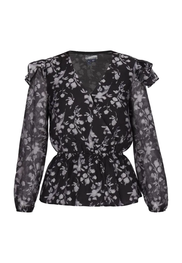 Laat u betoveren door de charme van deze prachtige blouse met fascinerend bloemmotief. De V-hals en delicate ruches op de schouders stralen vrouwelijkheid uit. Met lange mouwen en elastische manchetten voor een licht pofeffect, biedt het een chique silhouet dankzij de getailleerde pasvorm. Dit elegante ontwerp is gemaakt van lichtgewicht, soepele stof en kan moeiteloos worden gedragen bij casual tot semi-formele gelegenheden. Blouse