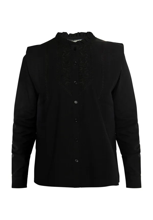 De lichtgewicht blouse van DreiMaster Vintage is gemaakt van puur katoen en heeft een losse pasvorm. Het romantische model heeft delicate bloemenborduursels en een kraag met ruches. Het versierde schoudergedeelte, de doorlopende knoopsluiting, de rechte zoom en de manchetten met manchetten ronden het ontwerp af. Blouse