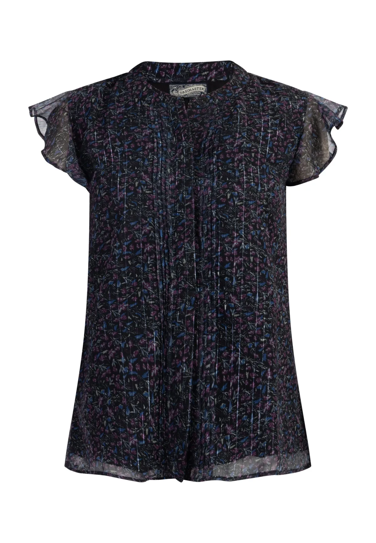 Een vleugje blouse! De semi-transparante blouse met korte mouwen van DreiMaster Vintage maakt indruk met zijn delicate mini-opstaande kraag en ruches aan de mouwen. De korte mouwen weerspiegelen de delicate speelsheid en de all-over bloemenprint, die is verweven met glanzende metallic draden. Het betoverende blouseoverhemd past zowel bij broeken als bij rokken. Blouse
