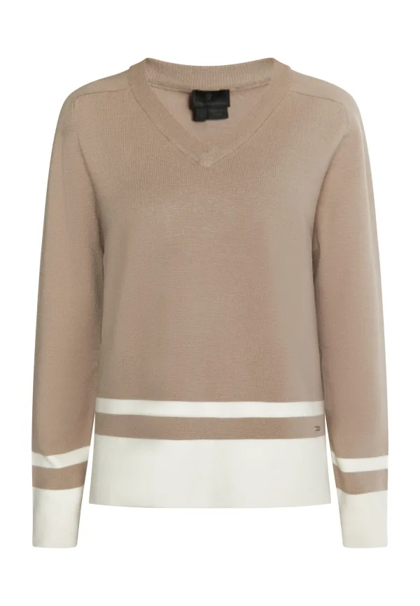 Geen voering/geen voering Voor deze elegante trui van DreiMaster Klassik werd een gerecycled nylongaren van drijvende visnetten en een zachte viscose gebruikt. De rechte pasvorm heeft contrasterende strepen en kleine zijsplitten. De vrouwelijke V-hals maakt het ontwerp compleet. Gebreide trui