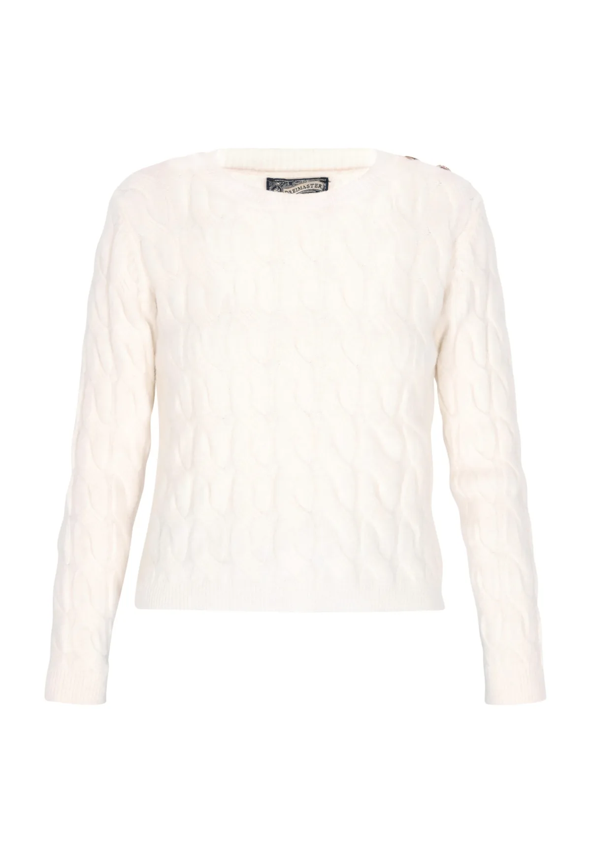 Deze gebreide trui overtuigt door een tijdloos kabelpatroon en een nauwkeurige afwerking. De ronde hals en lange mouwen creëren een klassieke look, terwijl geribde details aan de zoom, manchetten en halslijn een verfijnde touch aan het ontwerp toevoegen. Een knoopsluiting langs één schouder voegt een uniek accent toe aan dit veelzijdige kledingstuk, perfect voor verschillende gelegenheden bij koeler weer. Jumper