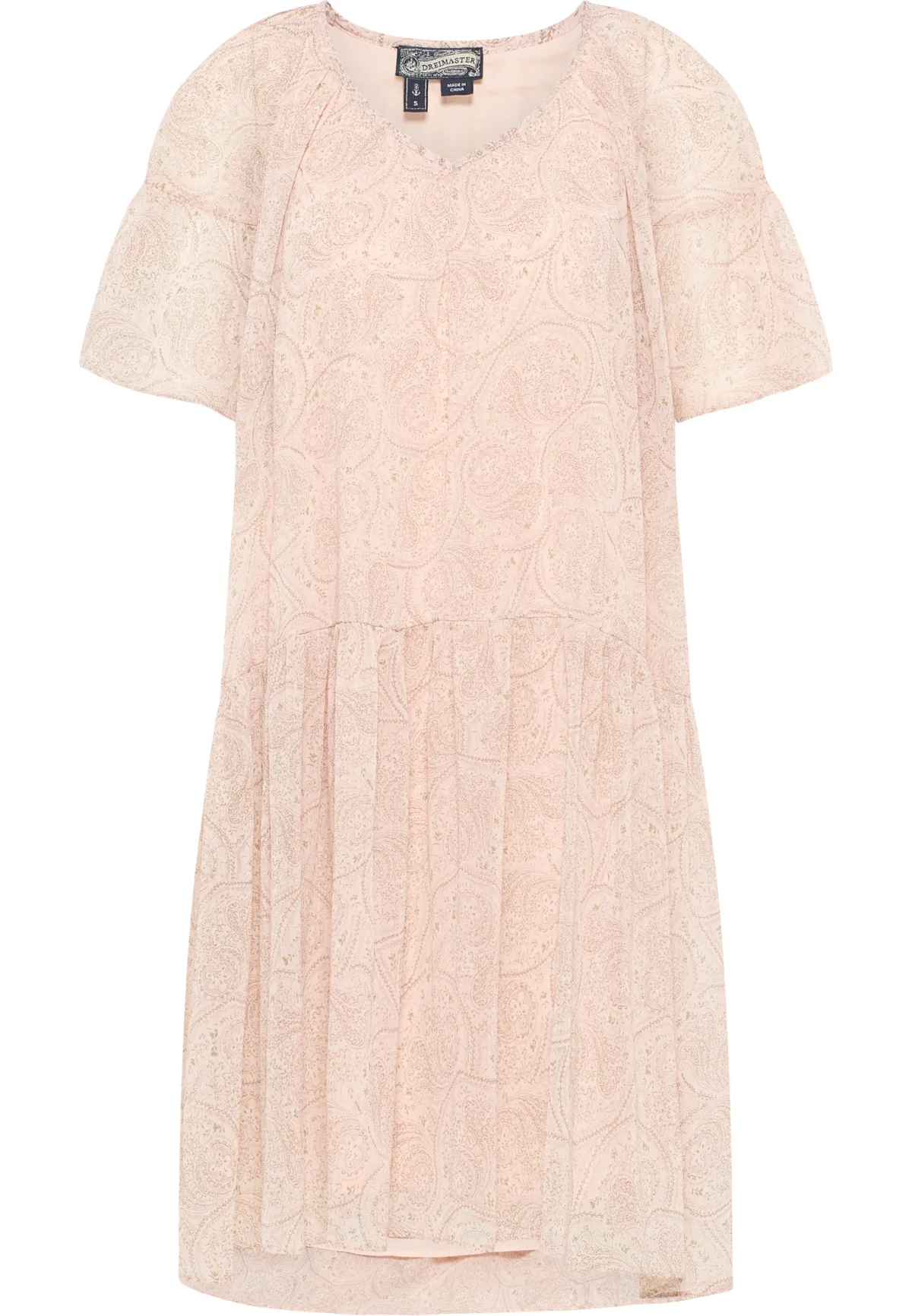 In een trendy midi-lengte en met een wijde, uitlopende pasvorm garandeert de jurk van DreiMaster Vintage een hoog draagcomfort. De nadruk ligt op een vloeiende kwaliteit met een delicate bloemenprint en de fladderende kapmouwtjes. De zomerse look wordt perfect afgerond met de V-hals en de volant aan de zoom van de rok. Jurk