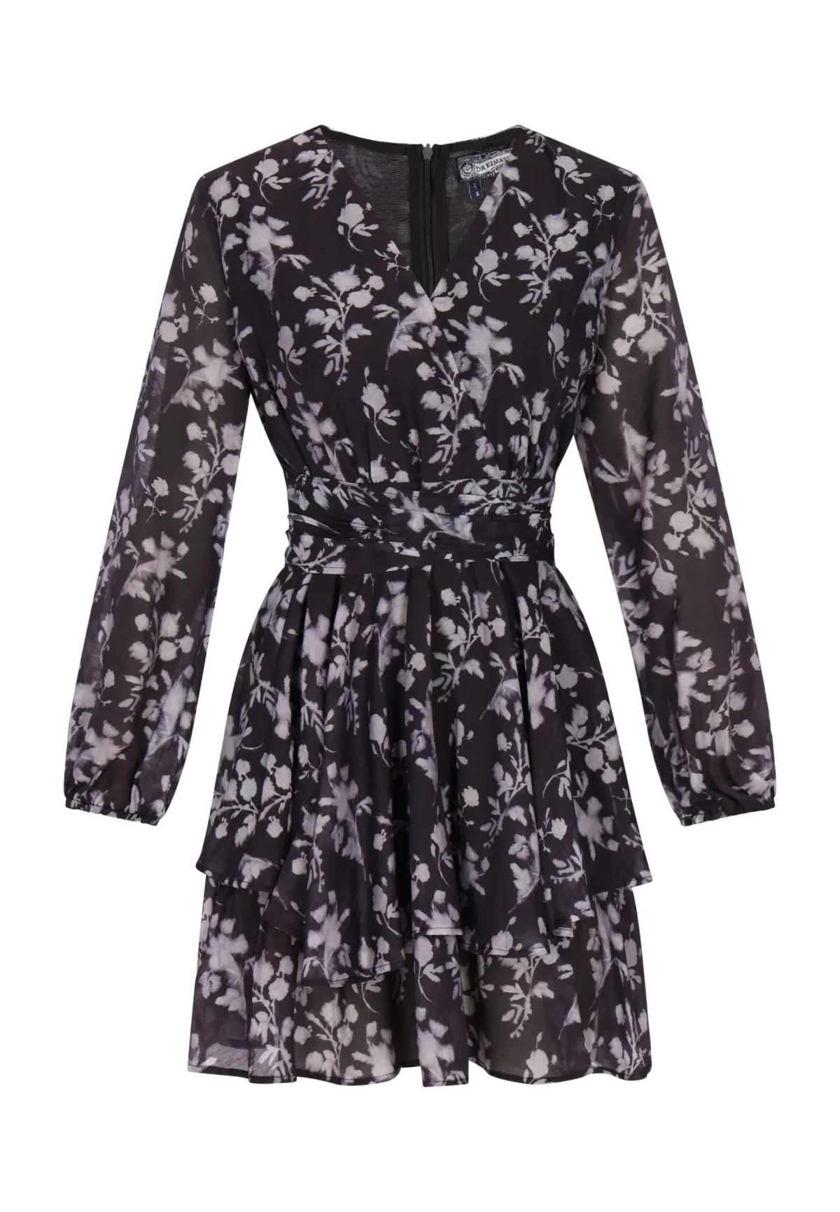 Dompel jezelf onder in de charme van deze romantische chiffon mini-jurk met lange bisschopmouwen en een V-hals. De chiffonstof zorgt voor een transparante look, versierd met een delicate bloemenprint. De nauwsluitende taille accentueert het figuur en de uitlopende rok voegt vrouwelijkheid toe. Deze jurk is perfect voor informele of semi-formele gelegenheden en straalt elegantie en charme uit. Jurk