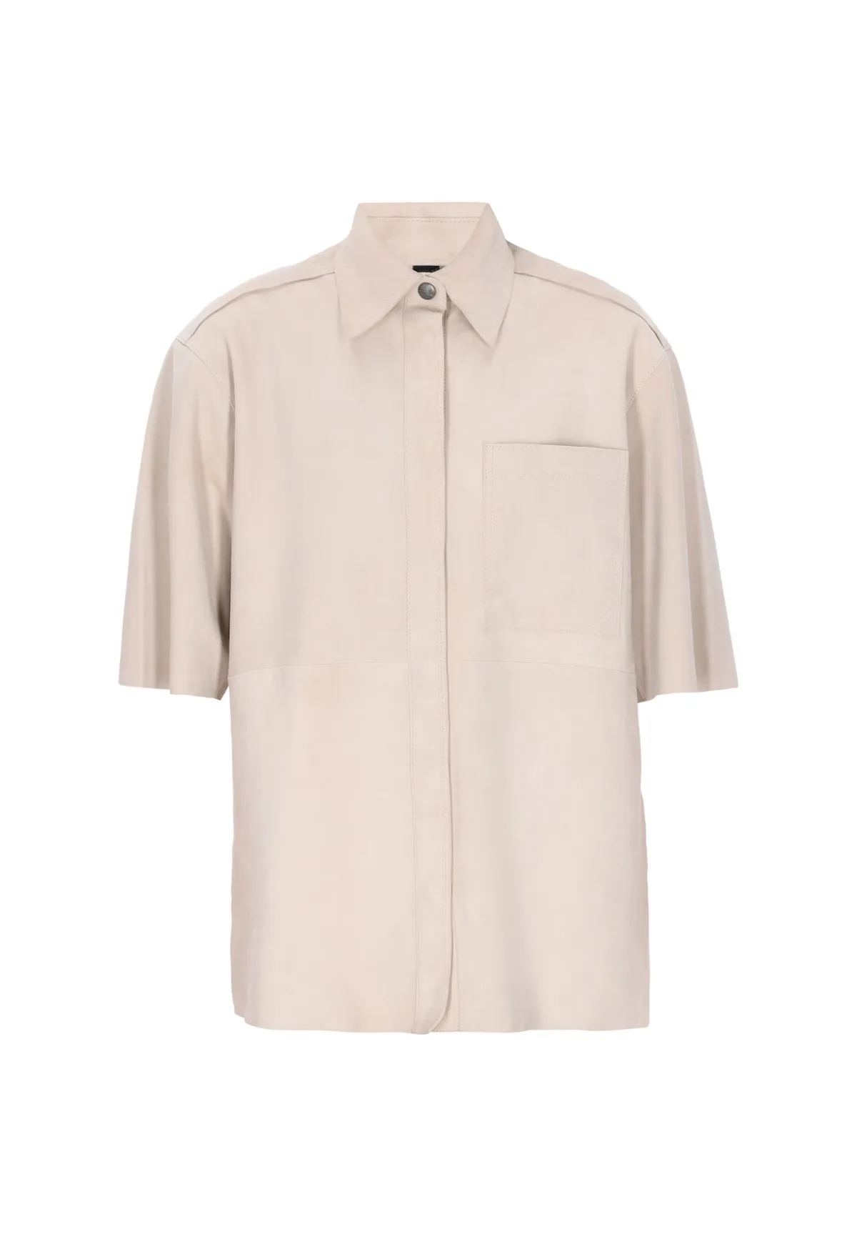 Blouse type: Klassieke blouse; Design: Gevoerde zoom/rand, Drukknopen, Turn-down kraag, Borstzak; Type sluiting: Drukknoop; Materiaal: Leer; Motief: Effen; Kraag: Kentkraag; Extra's: Op staal naden, Stevige stof; Pasvorm: Losse pasvorm; Armlengte: Halve mouw; Lengte: Normale lengte