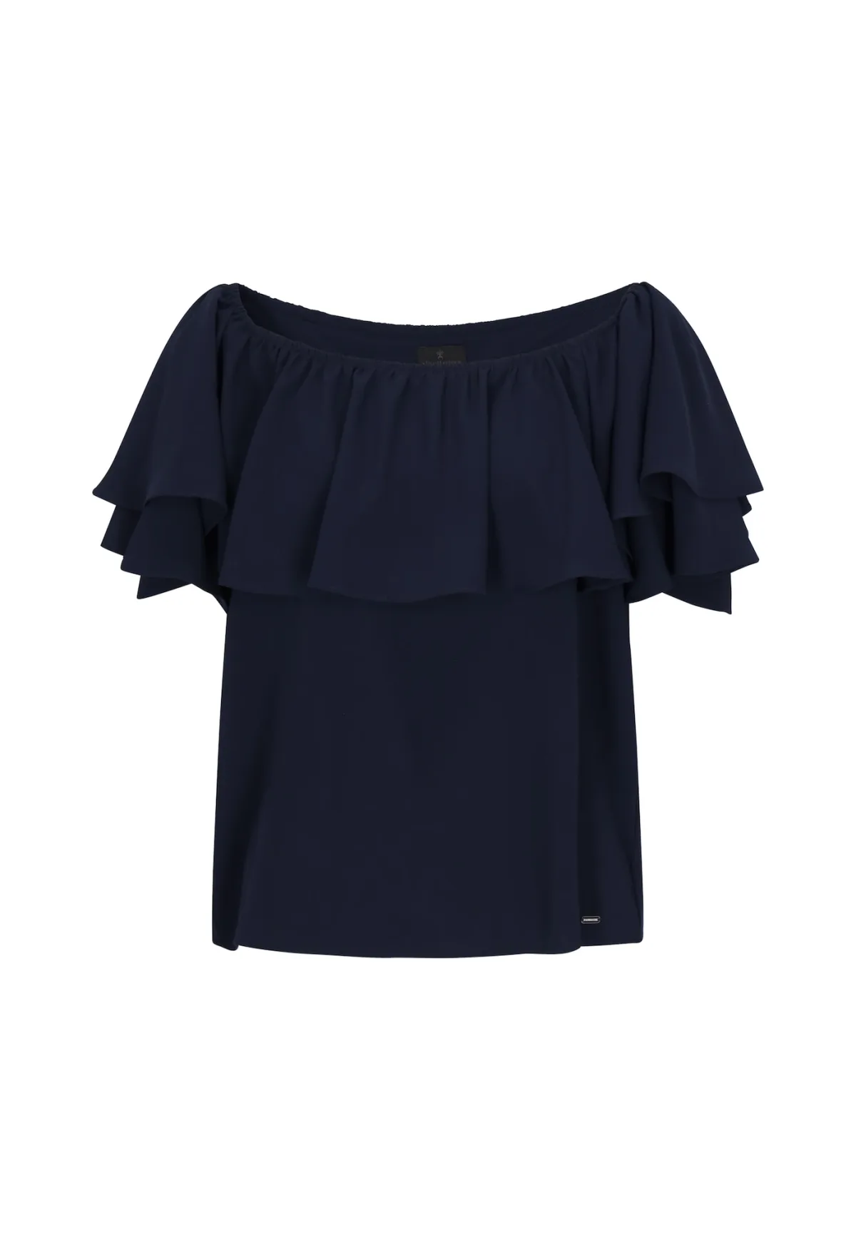 Blouse type: Blouseshirt; Design: Gevoerde zoom/rand, Strapless/off-shoulder; Type sluiting: Slip; Motief: Effen; Kraag: Zonder kraag; Details: Volant, Gedrapeerd; Extra's: Label plaatje, Op staal naden; Pasvorm: Normale pasvorm; Armlengte: Halve mouw; Lengte: Normale lengte